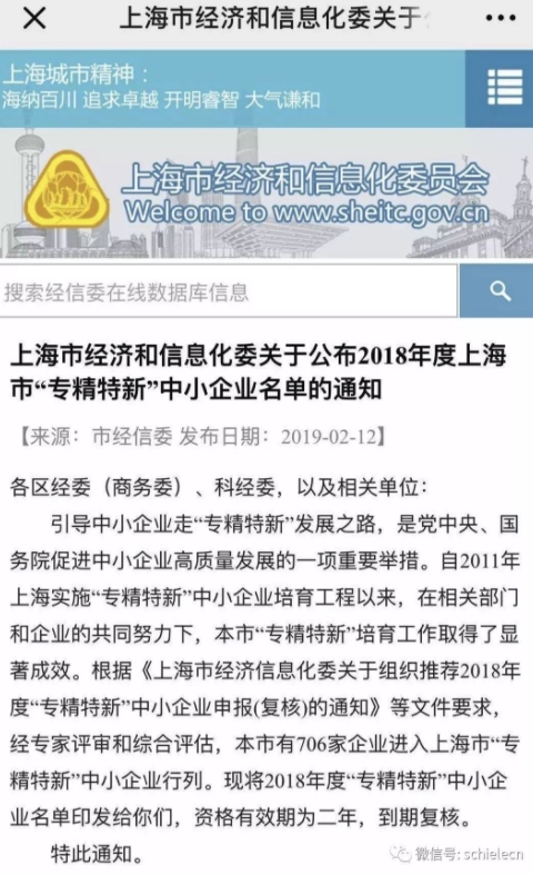 2月12日,上海市經濟和信息化委員在官網宣布《上海市經濟和信息化委對于發布2018年度上海市“專精特新”中小企業名單的告訴》(滬經信企〔2019〕95號),施勒智慧化新材料技術(武漢)股分無限大大公司(通稱“施勒智慧化”)躋身此中。